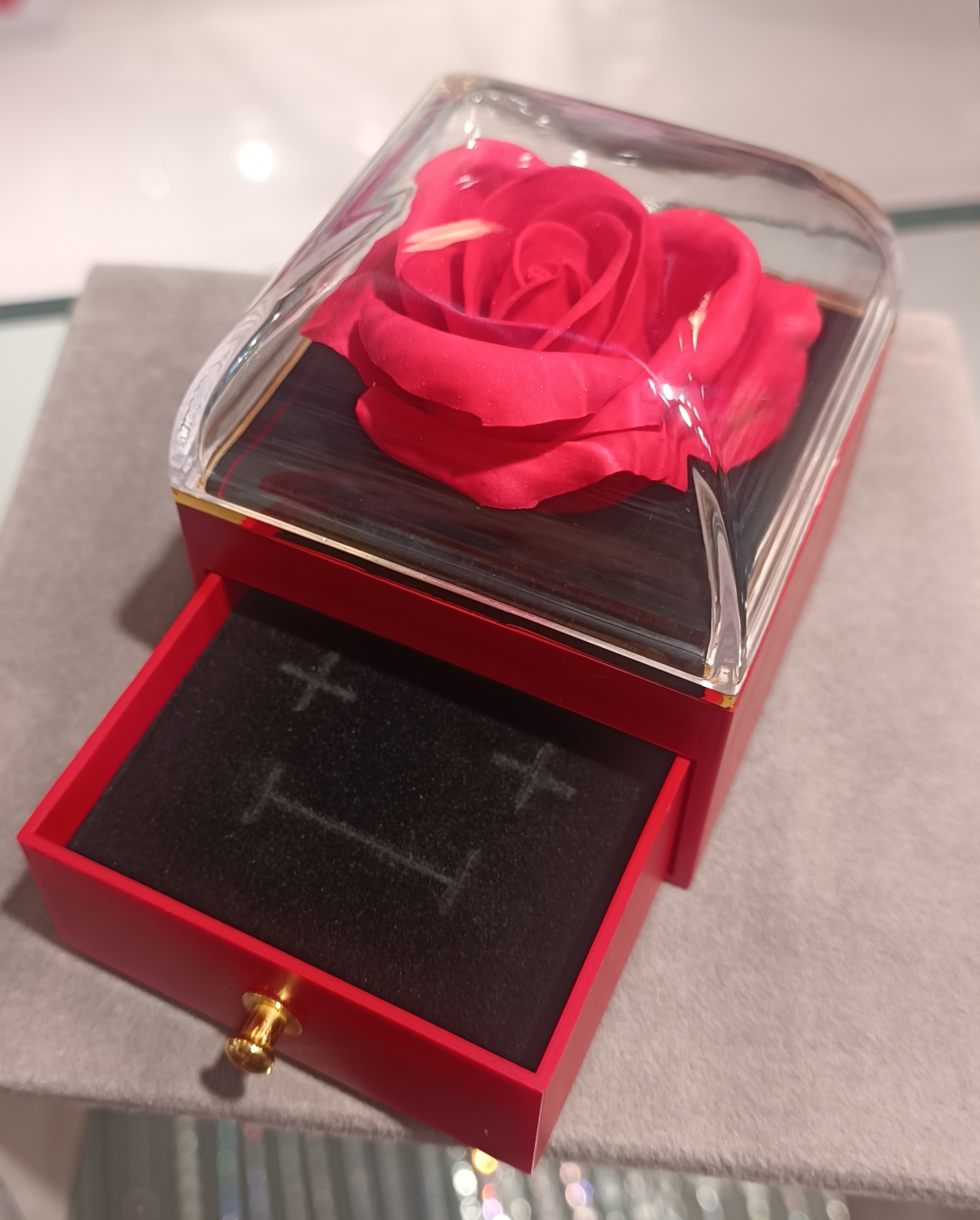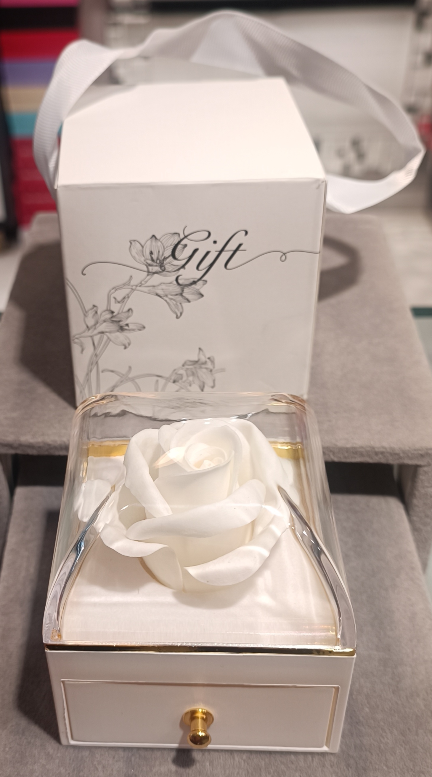 جعبه هدیه کشودار با گل رز جاویدان مناسب برای قرار دادن گردنبند نیم ست و انگشتر و دستبند در داخل کشو به همراه جعبه دسته دار شیک دارای سه رنگ